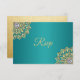 Elegantes y modernas tarjetas de respuesta boda RSVP de la India, verde azuladas, azules, turquesas y verdes. Se puede cambiar el color de fondo. Bonito diseño de flores de oro y diamante Mandala. La espalda tiene un falso Relieve metalizado de oro. Plantillas editables: agregue el texto. Contacte con el diseñador para otras variaciones.