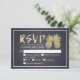 Plantillas de tarjetas de respuesta RSVP de bodas - Elegante Pareja de piña de Relieve metalizado dorado falso sobre fondo de línea de damasco floral azul de la marina. ¡Un Diseño Perfecto Para Tu Gran Día! Todos Los Estilo De Texto, Los Colores Y Los Tamaños Se Pueden Modificar Para Ajustarse A Sus Necesidades.