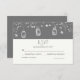 tarjetas de respuesta boda rústica con luciérnagas, tarros de albañil, luces de cuerda y ramas de árbol. Tarjeta RSVP de boda dibujada a mano.