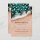 Cartas de respuesta al menú de bodas de destino de playa con una costa de arena tropical, olas del océano, hojas románticas de palma, luces de cuerda y una plantilla rsvp de entrada de comida boda.