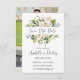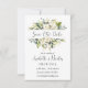 Este diseño presenta un ilustracion de rosas blancas con un follaje colorido y vibrante al estilo acuarela. El texto "Guardar la fecha" está escrito en un guión.