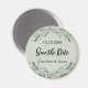 Un imán Save the Date para los invitados bodas. Un fondo verde salado decorado con flores de lavanda y eucalipto. Personalice y agregue sus nombres y fecha de boda.
