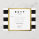 Tarjetas de respuesta de RSVP de boda cuadrada moderna con fondo de rayas negras y blancas con marco de efecto de papel de oro.