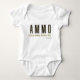 Este traje de bebé es unisexo y muestra las palabras "AMMO" en una letra fina impresa con letras doradas contorno negro que compone el acrónimo A.M.M.O que representa (Movimiento Ambicioso Motivando a Otros) en este estilo y tema de AMMO Apparel USA. Este traje de cuerpo es de ajuste estándar con una etiqueta lacrimógena fácil, además de un cierre de tres anillos y una unión de doble aguja en todas las aberturas.