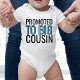 Este diseño en particular presenta una frase linda impresa en la parte delantera que dice "Ascendido a primo mayor". El texto probablemente esté en una fuente juguetona y infantil que añade a la naturaleza alegre y ligera del mensaje. La frase "Ascendido a primo mayor" sugiere que el bebé tiene un nuevo miembro en la familia, un primo menor, y celebra la emoción y la responsabilidad de ese nuevo rol. El diseño probablemente atraerá a padres o cuidadores que tienen una familia en expansión y que desean reconocer los importantes hitos y transiciones que ocurren como resultado. El mensaje es divertido y entrañable, destacando el vínculo especial entre primos y la alegría que conlleva dar la bienvenida a un nuevo miembro en la familia.