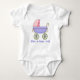 Traje para el cuerpo de una niña dulce, con adorables gráficos de un vagón de bebé color rosa y azul perwinkle. El texto azul de abajo dice: "Así es como rollo, y es el personalizable de leer lo que quieras. Adorable rastreador para el recién nacido, y hace un gran regalo para bebés. Ver a otra bebé más abajo.