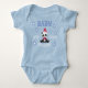 "BEBÉ está frío afuera" declara la parte delantera de este adorable bodysuit de bebé. El texto está en azul lavanda y blanco, y separado por un adorable oso panda bebé que lleva una bufanda roja y un sombrero de Santa. Hermosos copos de nieve azules ornamentados caen alrededor de la imagen y el texto. Perfecto todo el invierno, pero especialmente para la temporada de vacaciones.