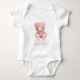 Cuerpo de bebé adorable con el dulce osito de peluche azul con un lazo a juego y estrellas azules suaves en un fondo azul bebé claro. Personalice con el nombre del bebé o un mensaje corto debajo del oso. Diseño cómodo y wearable ideal para fotos de recién nacidos, fiestas de bebé y conjuntos de bienvenida en casa. Disponible en varias tallas con arte centrado en la parte delantera y opciones de color coordinadas para una colección de fiesta cohesiva.