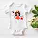 Linda princesita con rosas rojas, vestido rojo y cabello oscuro