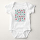 Este traje de bebé tiene un diseño atómico moderno de mediados de siglo de formas de boomerang, antenas y estallidos en verde azulado, magenta, azul y negro.