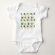Este traje de bebé tiene un diseño escandinavo repetitivo de un bosque en tonos marrones y verdes y amarillos.