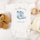 Este bodysuit de bebé presenta una ilustración de acuarela de un par de botas de vaquero azules. Arriba, la frase "Nuestro pequeño vaquero" u otro texto de su elección aparece en escritura a mano azul. Personalice con el nombre del bebé abajo. Un diseño ideal para una ducha de bebé de niño.