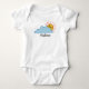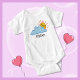 Bodysuit de bebé lindo, soleado amarillo feliz asomando desde una gran nube azul con una plantilla debajo para agregar su nombre, cita, texto o eliminar para dejar en blanco.
