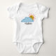 Bodysuit de bebé lindo con sol amarillo feliz asomando desde una gran nube azul con una plantilla debajo para agregar tu nombre, cita, texto o dejar en blanco.