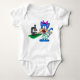 Esta imagen muestra una prenda de bebé blanca impresa con un alegre gato personalizado azul usando una bata de laboratorio y un arco rosado, de pie orgullosamente al lado de un microscopio sobre una mesa verde. La amplia sonrisa y los brazos abiertos del personaje le dan una atmósfera divertida y educativa, perfecta para pequeños científicos futuros o mentes curiosas. Un diseño lúdico e inteligente ideal para los trajes temáticos o como un regalo lindo que celebra el aprendizaje y el descubrimiento.