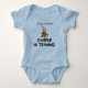 El diseño incluye la cita "Camper In Training" (Entrenamiento de camper) con un dibujo de fogata. También se puede personalizar con el nombre de su bebé. Es la forma perfecta de anunciar su embarazo a su marido o a su familia