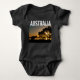 Un hermoso traje de bebé negro con una magnífica imagen de puesta de sol que muestra (el contorno) un canguro, un árbol y las mundialmente famosas Montañas Glass House en Queensland, Australia. La espectacular puesta de sol dorada le da a la imagen un gran color. Tu pequeño se verá aún más adorable ;)
