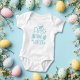 Este bodysuit de bebé presenta una imagen con texto azul "Cazador por primera vez" con huevos de Pascua. Perfecto para el primer Pascua de su bebé.