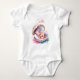 Camiseta de bebé de una pieza personalizada para la fiesta de bebé de niña, consigue una para todos en la familia para hacerles sentir especiales. Dulce suave rosa pastel, coral, azul y dorado tema de fiesta de bebé costera marina. Una pequeña bebé durmiendo dentro de una concha y conchas doradas. Hermosas flores tropicales acuarelas caprichosas. Caballito de mar acuarela, dólar de arena, flores tropicales y estrella de mar.