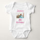 Creada para ser un tesoro personalizado para la chica de cumpleaños, esta ropa blanca muestra su nombre en la parte superior en texto cursivo rosa. Debajo está tu foto favorita de ella subida fácilmente usando las plantillas de Zazzle. Debajo está el texto de ejemplo "Segundo cumpleaños". ¡El tuyo es un personalizar fácil hoy! Fotografía © Storytree Studios, Stanford, CA