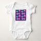Este traje de bebé tiene un diseño moderno de mitad de siglo de círculos, algunos con estrenos, algunos con círculos pequeños y otros simplemente sólidos, en azul y violeta.