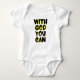 Este diseño de traje de bebé tiene las palabras "Con Dios que puedas" en una impresión de estilo burbuja más letras negras y contorno de sombra amarilla con un estilo tipográfico en este tema basado en la fe. Este traje de cuerpo es de ajuste estándar con una etiqueta lacrimógena fácil, además de un cierre de tres anillos y una unión de doble aguja en todas las aberturas.