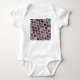 Este traje de bebé tiene un diseño art deco de cuadrados hechos de ángulos superpuestos en tonos retro de azul y rosa.