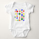 Este traje de bebé tiene un diseño Bauhaus de una cuadrícula con formas en rojo, amarillo, naranja, verde y azul trazadas sobre ella.