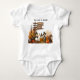 El adorable traje de cuerpo de una pieza tiene cuatro patos vestidos con disfraces para Halloween. Hay un esqueleto, una calabaza, un fantasma y una bruja parados en la entrada de un camino con árboles espeluznantes, calabazas y algunos carteles de madera. Tu bebé se verá tan lindo usando este traje de halloween durante la temporada de Halloween. También está disponible como camiseta.