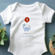 Traje de cumpleaños del niño dinosaurio primero cuenta con un dinosaurio azul pastel que sostiene un globo rojo con el número 1 dentro del globo en un entorno colorido y divertido con tema de dinosaurios. Personalízalo con la edad y el nombre de tu hijo.
