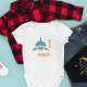 Traje de cumpleaños adorable que combina con nuestras invitaciones y suministros para la fiesta de Cumpleaños de Tiburón. El diseño presenta un tiburón azul sonriente y lindo con la edad de su hijo al lado y el nombre debajo. ¡Perfecto para las fiestas del primer cumpleaños y sesiones de pastel!