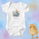This cute baby and toddler clothing design, for a one-piece bodysuit or tee, features a cute yellow baby chick perched atop a decorated blue and yellow Easter egg. Spring flowers and ferns surround the egg, with your child's monogram name underneath. Make sure to replace the placeholder with your child's name. If you don't want to include the name, just delete the placeholder. This cute design is perfect for Easter or any spring day.