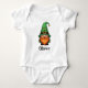 This cute St. Patrick's Day Gnome baby bodysuit features a friendly gnome sporting a tall, vibrant green leprechaun hat adorned with a clover shamrock and a classic gold buckle.