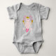 Este mono de traje de bebé tiene una imagen de arte digital de un lindo axolotl, un salamandra mexicano, con sombrero y maracas temblando. El axolotl es rosa pálido, con doraduras de plumaje rosadas brillantes y una cola rosa brillante. Tiene ojos enormes y una sonrisa en su cara. El sombrero es amarillo con un cactus verde en el medio. El cactus está rodeado de chiles y girasoles mexicanos, también llamados Tithonia. Las Maracas son amarillas con flores rojas y verdes y con líneas onduladas.