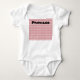 Este traje de bebé tiene un diseño art deco de diamantes superpuestos en rosa sobre un campo de blanco. Cambiar el texto o eliminarlo completamente.