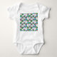 Este traje de bebé tiene un diseño boho de flores dentro de ovales que se han dividido en cuartos y se han colocado en una cuadrícula.