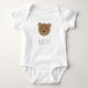 Un adorable ilustracion de oso ocupa el centro de la escena en este bonito y moderno diseño. Nuetral de género. Fácil de personalizar con el nombre del bebé.