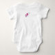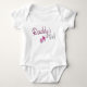 Este sencillo diseño "Papi's Chica" en escritura rosa y púrpura acentuado por un pacificador rosa. También hay un pequeño pacificador rosado en la parte posterior de la ducha entre los hombros. Esta es una manera perfecta para que papá eche a perder a su pequeña princesa.
