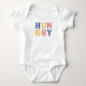 Un mono bodysuit con un diseño sencillo y moderno con la cita HUNGRY en una vibrante paleta de naranja, azul y amarillo