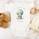 Esta camiseta de bebé presenta una ilustración de acuarela de un panda en un globo aerostático verde menta rodeado de flores. Arriba, las palabras "¡Estoy listo para la aventura!" aparecen en escritura a mano verde menta. Personaliza con el nombre del bebé abajo.