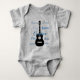 Camiseta diseñada por HAMbyWhiteGlove con gráfico de guitarra negra y plantillas que puedes personalizar con tu nombre, o dejar las cosas lindas que escribimos, "Guitarra", "Rock on" "canta", "baila", "sonríe", "abraza", "toca" y "brilla", guitarra, todo en diferentes tonos de azul bebé. ¡Muy divertido! Se muestra en una camiseta gris de snap, para tu pequeño bebé que toca la guitarra.