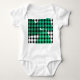 Este traje de bebé tiene un diseño moderno de mediados de siglo de diamantes negros sólidos en el interior de los contornos de diamante negro con triángulos en tonos de verde marino bajo ellos, todo en un campo de blanco.