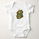 Un bodysuit de bebé adorable con una jirafa, nombre personalizado y fondo verde. Jirafa amarilla y marrón con fondo verde frondoso y nombre.