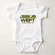 Este traje de bebé muestra un diseño que presenta las palabras "Jesus Wept" con las escrituras bibliales del Rey James John 11:35 en una letra en negrita con letras amarillas y negras con contorno amarillo y negro más citación de la biblia debajo de este tema bíblico basado en la fe. Este traje de cuerpo es de ajuste estándar con una etiqueta lacrimógena fácil, además de un cierre de tres anillos y una unión de doble aguja en todas las aberturas.