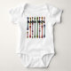 Este traje de bebé tiene un diseño moderno de mediados de siglo de líneas atómicas con "plumas" en ambos extremos y un contorno alrededor de cada uno.