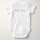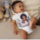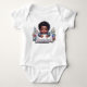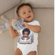 Un adorable bebé afroamericano que viste un bodysuit de bebé con una imagen de una pintura acrílica de un pequeño con sus preciosas manos sobre su almohada.