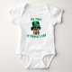Traje de "Mi primer hijo de Patrick". El diseño presenta un perro cachorro con un gorra de leprechaun verde y texto verde.