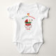 Un bebé en el coche de bebé de rojo y verde, y decoraciones con "Mi primera Navidad". Un Navidad lindo y único para que los bebés recuerden la primera Navidad de su bebé.