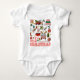 Mi primera camiseta de Navidad Imágenes retro divertidas para bebé Niña Niño Baby Bodysuit incluye el texto "Mi primera Navidad" en tipografía moderna con acentos de elementos divertidos como un camión con árbol, camiseta fea, adornos, regalos, medias, acebo, árbol de Navidad y decoraciones. Regalo perfecto de Navidad para una niña o un niño. Creado por Evco Studio www.zazzle.com/store/evcostudio