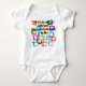 Este traje de bebé tiene un diseño de rectángulos que se estiran en un extremo en colores vivos, naranja, verde, verde azulado, morado, azul, rosa y amarillo, con líneas atómicas que los atraviesan.